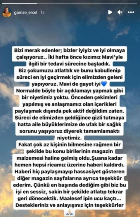 Announcing the news was Hande Erçel's sister Gamze, she posted a picture on her Instagram story, where she shared details on her daughter's diagnosis.