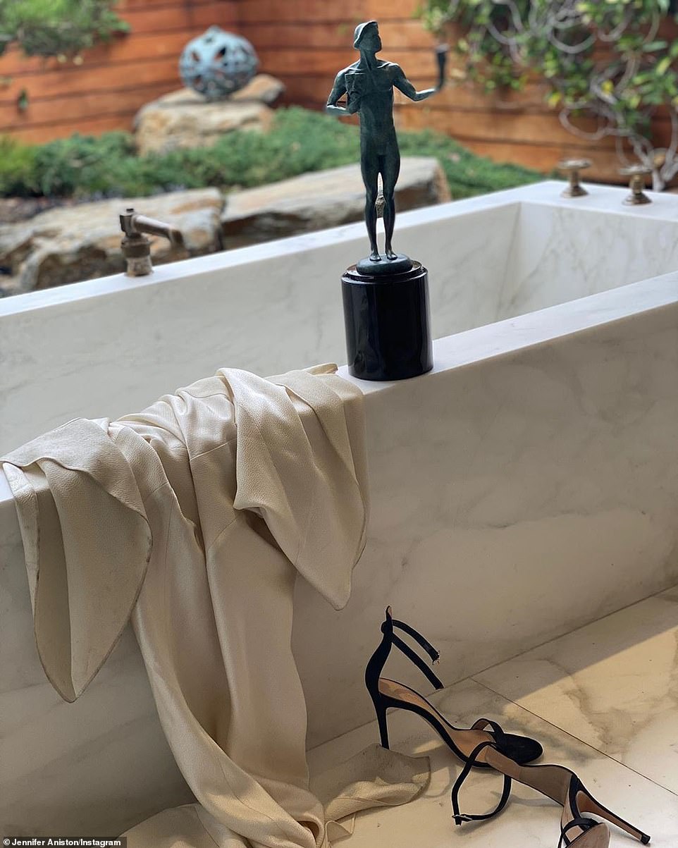 The image she shared on Monday to her Instagram showed her SAG Award for Best Actress in a Drama Series and her vintage Dior gown on top of her marble bathtub, which her heels strewn on the matching flooring.