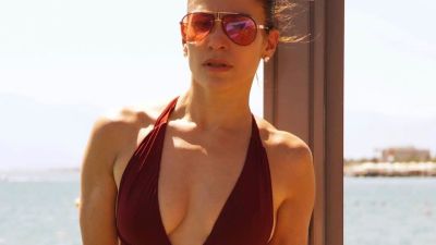 The singer, 50, displayed her athletic physique as she posed in a dark red bathing suit with a deep V-neckline.