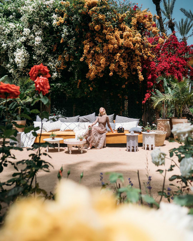 The model shared a sun-drenched photo from a flower-filled garden in Marrakesh — in it she soaks up the sun while seated on an orange lounger.