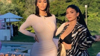 The reality star, 35, flaunted her curves in a tight baby pink dress that fit her like a glove as she struck a pose alongside Kylie Jenner on Thursday.