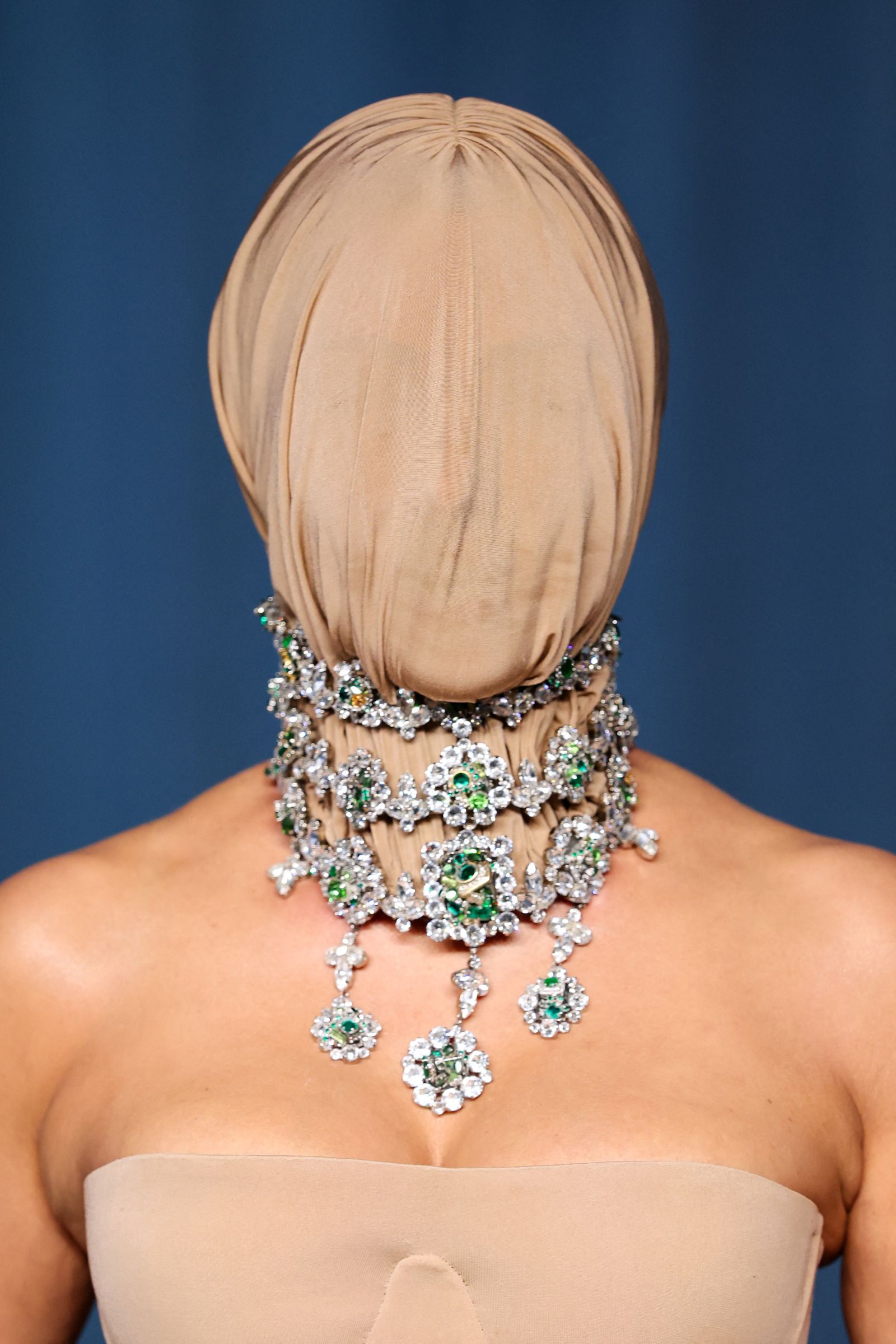 Kardashian wore a crystal-studded choker necklace with green stones and cross pendants to go with her face mask, which was also part of the Maison Margiela fashion look.