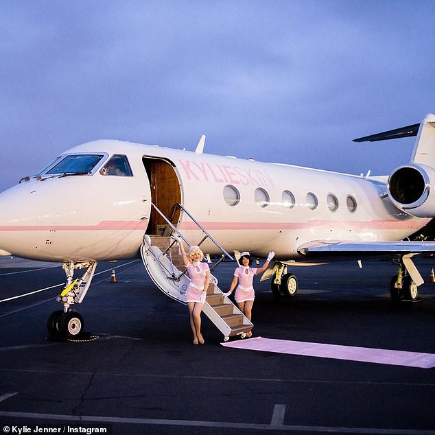 And on Saturday, Kylie Jenner promoted her latest project in a huge way - taking to the skies in a pink and white private jet bearing the name of her new collection.