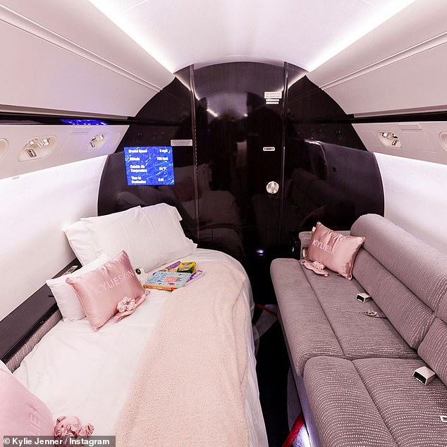 The jet's interior featured plush grey seats with a few pops of pink added thanks to some pink Kylie Skin satin pillows.
