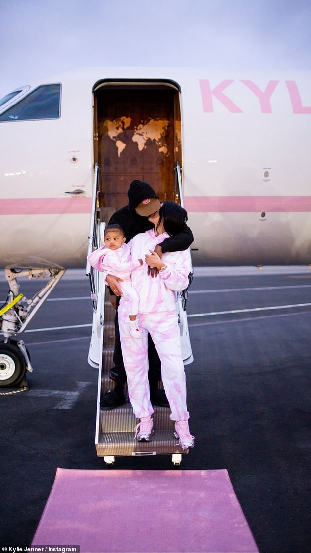 All aboard! Jenner, 21, invited her friends as well as one-year-old daughter Stormi to the jet's unveiling, rolling out a rose-colored carpet for them to walk on as they boarded the plane