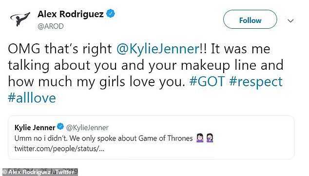 He wrote: ''OMG that’s right @KylieJenner!! It was me talking about you and your makeup line and how much my girls love you. #GOT #respect #alllove'.