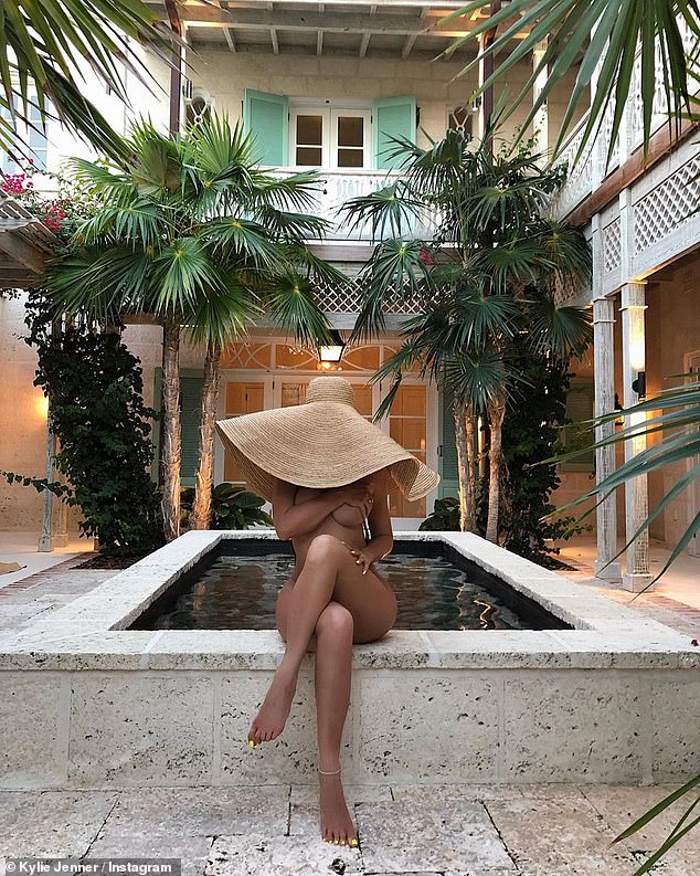 She posed completely naked aside from an enormous straw hat while perched by a pond at the villa.