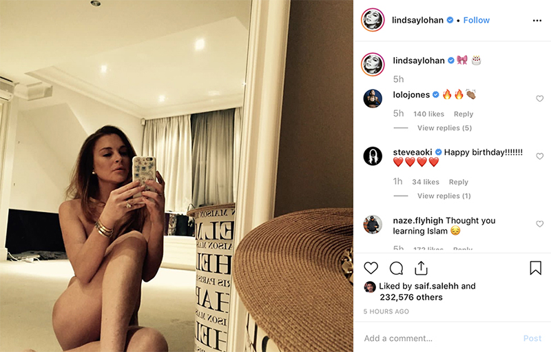 The 'Mean Girls' star turns 33 on Tuesday (07.02.19) and she celebrated the occasion as she surprised her followers with a racy snap on Instagram as she posed in the mirror with her arms and legs keeping her modesty.
