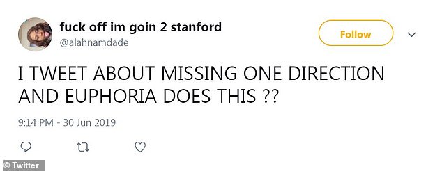 Another fan, @alahnamdade, said, 'I TWEET ABOUT MISSING ONE DIRECTION AND EUPHORIA DOES THIS ??'