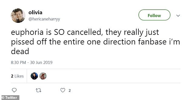 The scene lead to strong reactions from the One Direction fanbase, who are known as Directioners, with one fan dubbed @hericaneharryy stating, 'euphoria is SO cancelled, they really just pissed off the entire one direction fanbase i'm dead.'