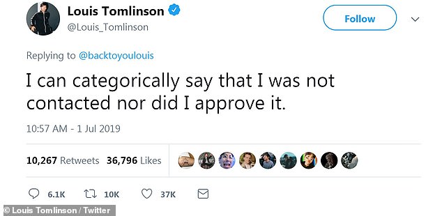 Tomlinson responded from his verified Twitter account, stating, 'I can categorically say that I was not contacted nor did I approve it.'