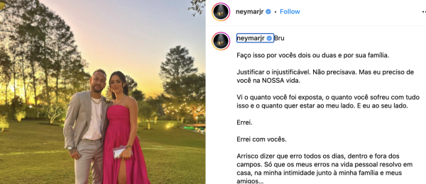 In the lengthy caption, Neymar admitted that he made a terrible mistake, and the he is sorry, hoping for his girlfriend to come back home to him.