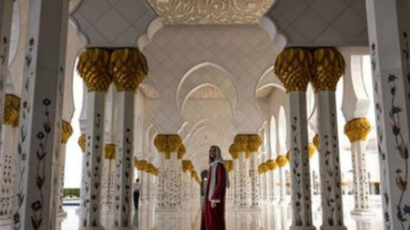 Dua made sure to do some sight seeing in Abu Dhabi before her sold out concert, and visited Al Sheikh Zayed mosque, wearing a long white hijab, and matched it with a conservative Red Abaya stylized with Arabic white typography.