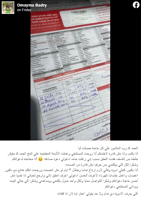 Earlier, Omayma posted on her Facebook page a medical report she had received and wrote: "Thank god for everything, I'm writing this to share the news with you that I went to the hospital and did a CT scans on the brain."