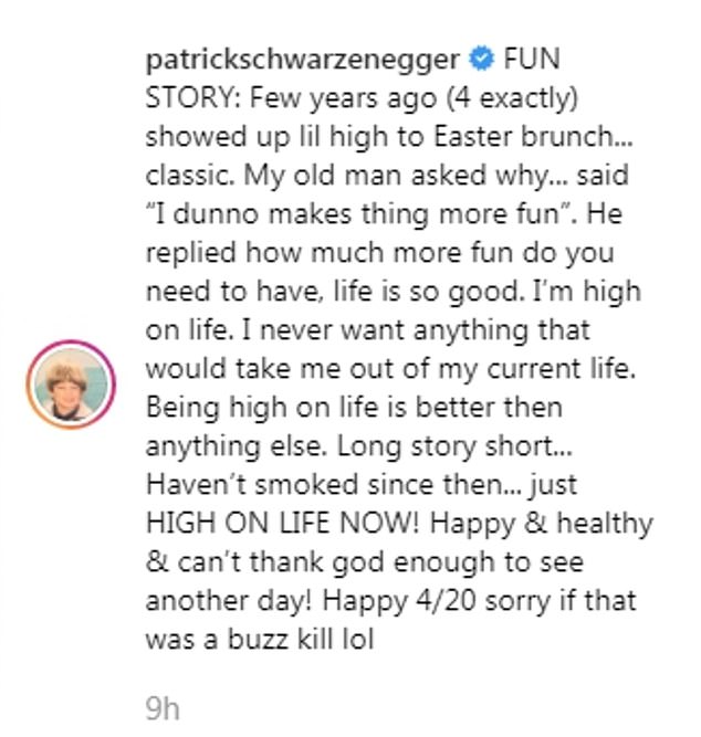 The son of the action hero and Maria Shriver wrapped up by saying, 'Long story short... Haven’t smoked since then... just HIGH ON LIFE NOW! Happy & healthy & can’t thank god enough to see another day! Happy 4/20 sorry if that was a buzz kill lol.'