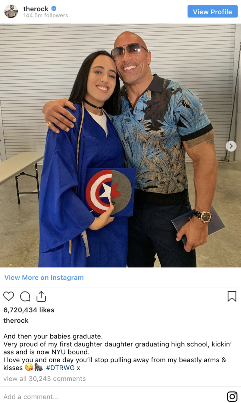 Movie star Dwayne "The Rock" Johnson is celebrating his daughter Simone's high school graduation on Instagram.