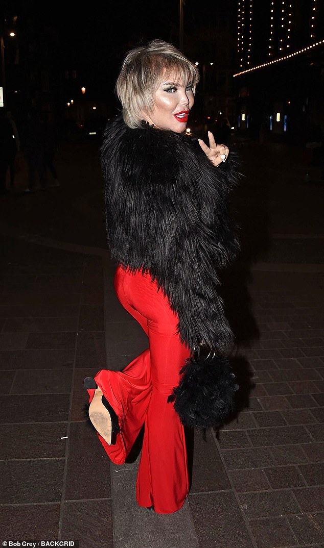 Roddy teamed the look with a plush feathered coat and figure-hugging red flared trousers.