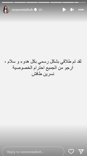 On July 13, Tafesh shared the news with her Instagram followers, she wrote: "I am officially divorced, It was peaceful and quiet, I ask for everyone to respect my privacy."