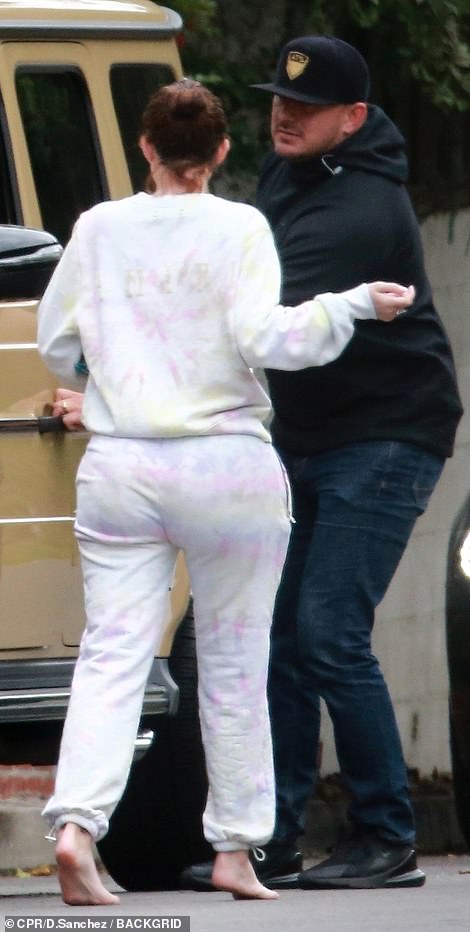 The mother-of-one was photographed wearing tie-dye sweats and walking barefoot to her car with a bag of salt and vinegar kettle chips under her arm.