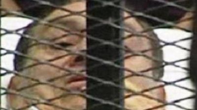 Inside the cage, Mubarak craned his head up to see the proceedings, a sheet drawn up to his chest. His two sons – Gamal and Alaa, who are on trial with him – stood next to his bed, leaning over to talk with him. The elder Mr. Mubarak and his nine co-defendants, also including his former interior minister, all wore white prison uniforms.