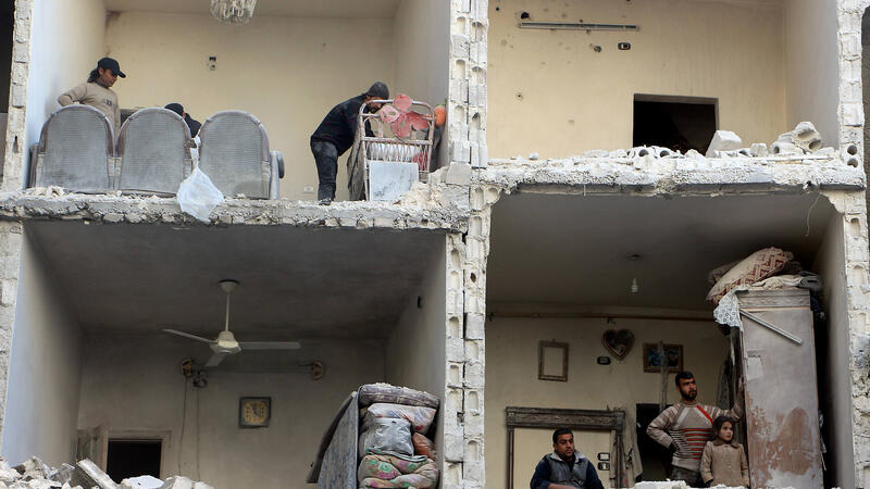 Civilians examine the bombed-out remains of a house in Aleppo, Syria following airstrikes in December 2015. (AFP/Karam al-Masri)