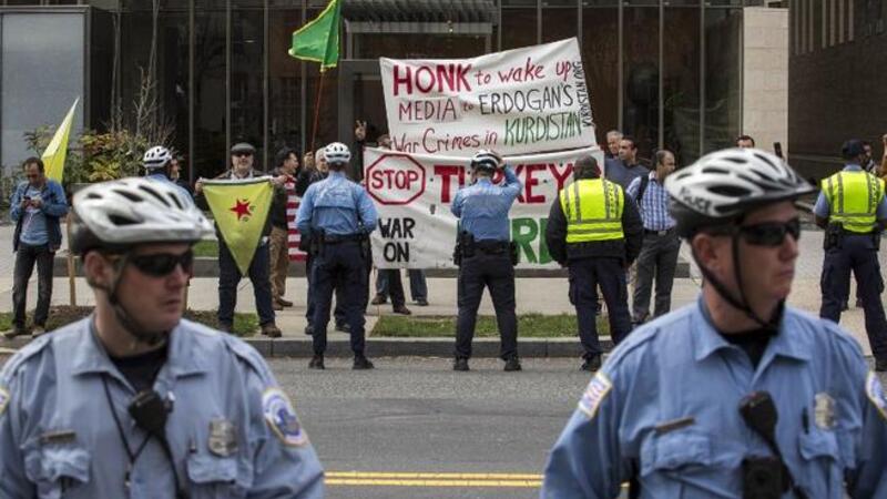 The Turkish Embassy has blamed the violence on demonstrators linked to the Kurdistan Workers Party, or PKK, which Turkey and the US consider a terrorist group.