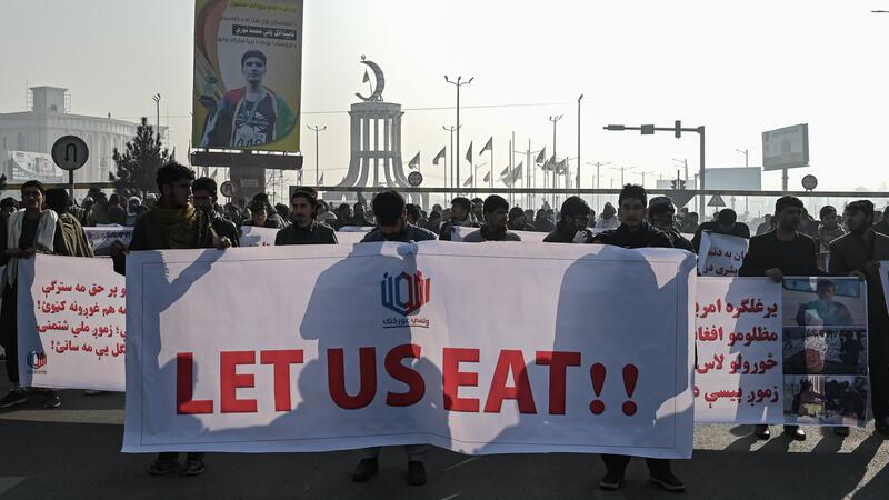 People hold a banner reading 'Let us eat' before marching on the street during a protest in Kabul on December 21, 2021, as the country struggles with a deep economic crisis. (Photo by Mohd RASFAN / AFP)