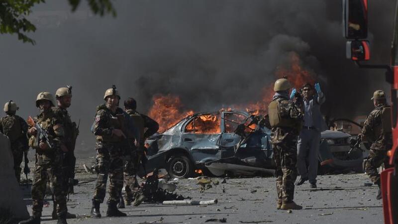 Afghan security forces personnel are seen at the site of a car bomb attack in Kabul on May 31, 2017. Shah Marai / AFP