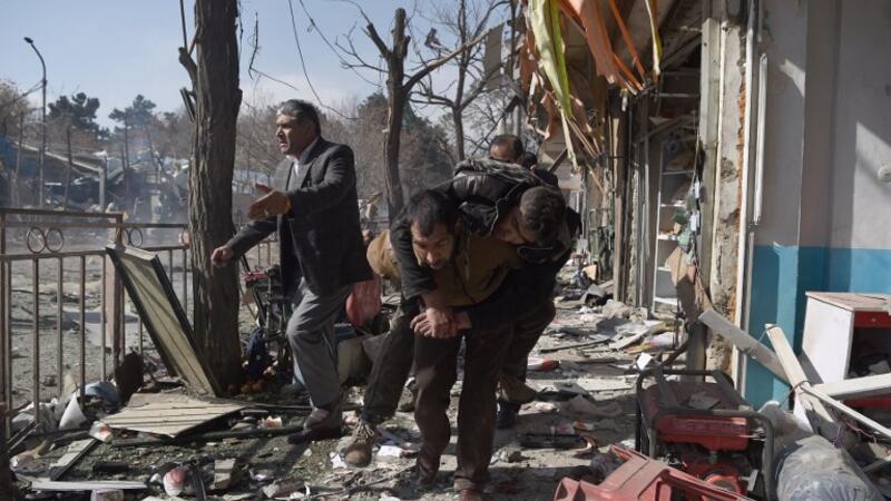 Afghan volunteers carry a body at the scene of a car bomb exploded in front of the old Ministry of Interior building in Kabul on January 27, 2018. (WAKIL KOHSAR / AFP)