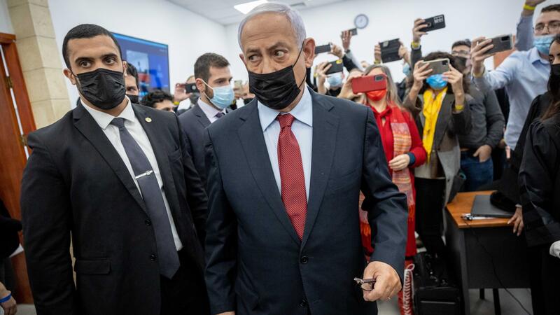 Former Israeli prime minister Benjamin Netanyahu arrives at the courtroom in the Jerusalem District Court, on March 23, 2022. Netanyahu is facing trial on charges of bribery, fraud and breach of trust in three separate cases. (Photo by Yonatan SINDEL / POOL / AFP)