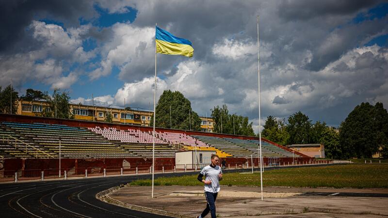 A photograph shows a man jogging at a stadium in the centre of the town of Slavutych on May 28, 2022, amid the Russian invasion of Ukraine. (Photo by Dimitar DILKOFF / AFP)