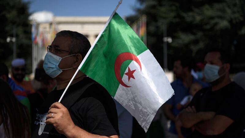 A man wearing a protective mask holds an Algerian flag during a demonstration in front of the United Nations Offices in Geneva against "arbitrary arrests" in Algeria, on August 23, 2020. Fabrice COFFRINI / AFP