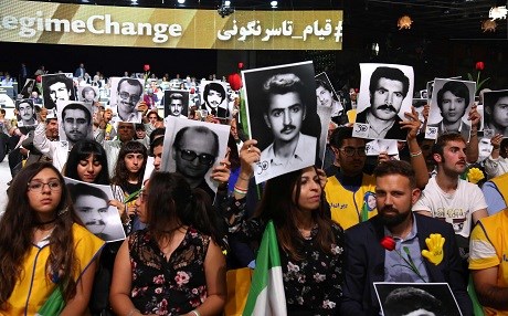 People hold up photos of family members killed by the Iranian regime during an MEK conference in Paris. Photo: Zakaria Abdelkafi/AFP