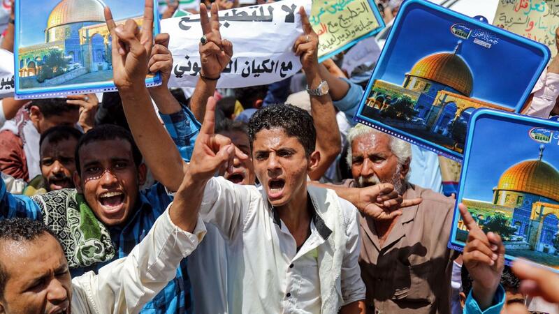 Demonstrators chant slogans with signs depicting Jerusalem's Dome of the Rock alongside other signs reading in Arabic "no to normalisation with the Zionist entity", during a protest in Yemen's third city of Taez on August 21, 2020. AHMAD AL-BASHA / AFP