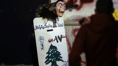A woman wearing a Dali mask of the Spanish Netflix hit series La Casa de Papel (Money Heist) rests her head on a shield during a Lebanese anti-government demonstration in the downtown area of the capital Beirut, on March 12, 2021. The country has been mired in economic crisis, leading to to surging unemployment and spiralling prices, while the currency has plunged to a new low to the dollar on the black market. JOSEPH EID / AFP