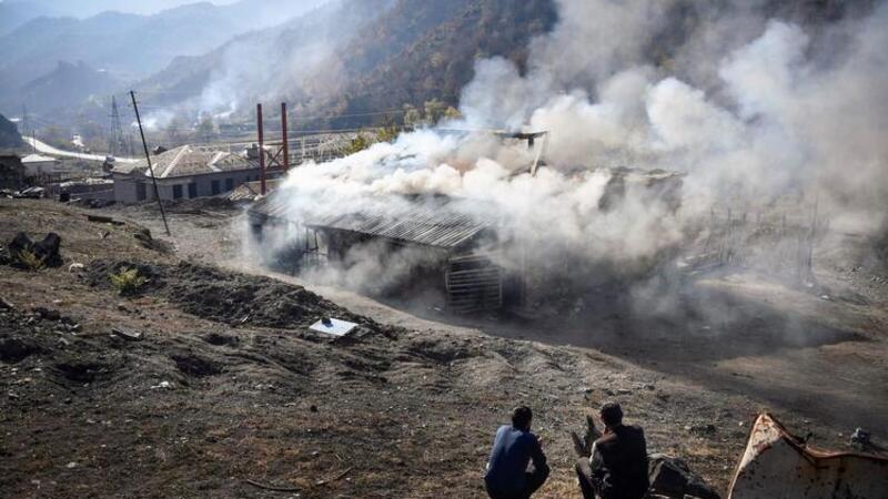Residents look at burning houses in the village of Charektar outside the town of Kalbajar on November 14, 2020, during the military conflict between Armenia and Azerbaijan over the breakaway region of Nagorno-Karabakh. Villagers in Nagorno-Karabakh set their houses on fire before fleeing to Armenia ahead of a weekend deadline that will see parts of the territory handed over to Azerbaijan as part of a peace agreement. (Photo by Alexander NEMENOV / AFP)