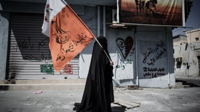 A Bahraini woman holds up her national flag decorated with anti-government slogans in the village of Jidhafs, west of Manama. (AFP PHOTO/MOHAMMED AL-SHAIKH)