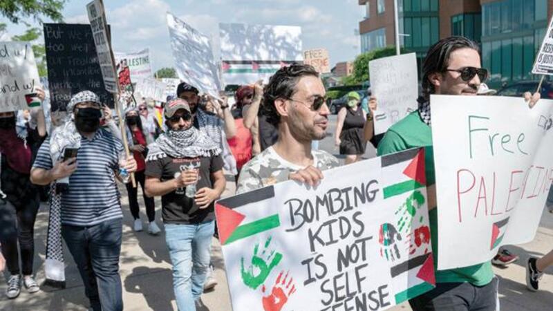 People chant and hold signs in support of Palestine during a protest march from Waterfront Park to City Hall on Sunday in Louisville, Kentucky (AFP File Photo)