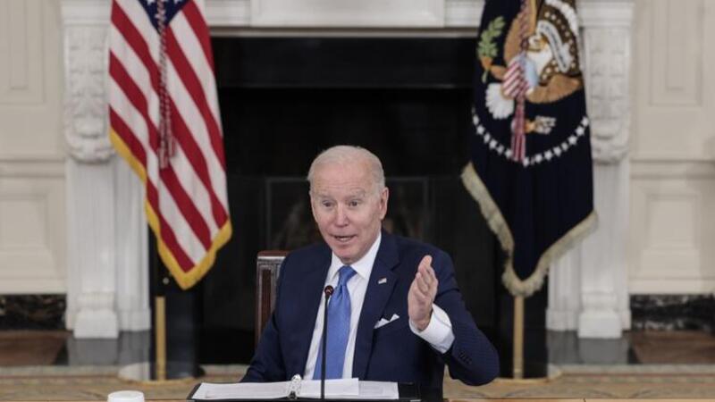 U.S. President Joe Biden gestures during a meeting in the State Dining Room of the White House on February 09, 2022 in Washington, DC. (Photo by Anna Moneymaker / Getty Images via AFP)
