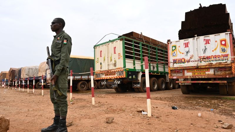 A Niger's police officer stands guard next to some of the 300 trucks mainly loaded with food that arrived from Burkina Faso in Niamey on August 21, 2023. A convoy of around 300 trucks mostly loaded with food arrived from Burkina Faso August 21, 2023 in Niamey, the capital of Niger under sanctions imposed by several West African neighbors after a coup. (Photo by AFP)