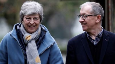 Britain's Prime Minister Theresa May (L) and her husband Philip leave after attending a church service, near her Maidenhead constituency, west of London on April 7, 2019. (Adrian DENNIS / AFP)
