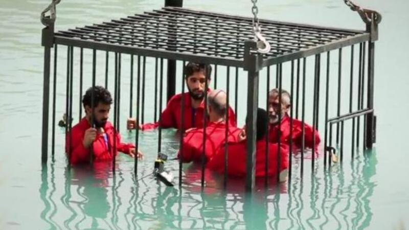 A militant is later shown locking five men dressed in jumpsuits into a large metal cage. The cage is then lowered by a crane into what appears to be a dirty swimming pool.