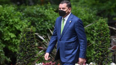 Libya's Prime Minister Abdulhamid Dbeibah arrives in Downing Street for a meeting in London on June 24, 2021. / AFP / DANIEL LEAL-OLIVAS
