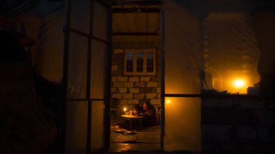 A Palestinian woman helps her son study, by candlelight, at their makeshift home in the Khan Yunis refugee camp in the southern Gaza Strip on April 19, 2017. (AFP/Mahmud Hams)