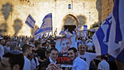 Israeli ultranationalists wave flags and a poster against Prime Minister Naftali Bennett during the March of the Flags near Jerusalem's Old City, on June 15, 2021, celebrating the anniversary of Israel's 1967 occupation of Jerusalem's eastern sector. Hebrew on portrait reads: "Naftali is a liar". AHMAD GHARABLI / AFP