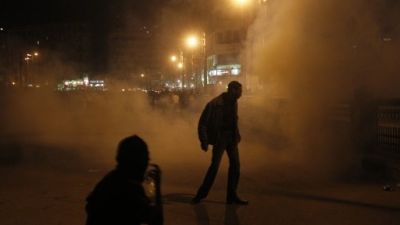 Some demonstrators hurled rocks at riot police positioned a few dozen meters (yards) on the other side of the wall, who responded with tear gas grenades.