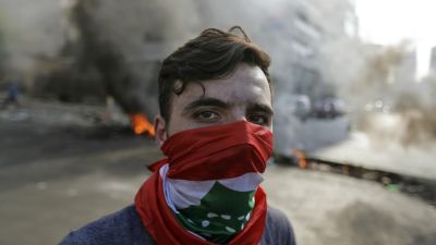 A Lebanese protester stands in front of burning tyres and debris in the area of Jal el-Dib, on the northern outskirts of the Lebanese capital Beirut, on November 13, 2019. A man was shot dead south of Beirut after the army opened fire to disperse protesters blocking roads, Lebanese state media said, nearly a month into an unprecedented anti-graft street movement. JOSEPH EID / AFP