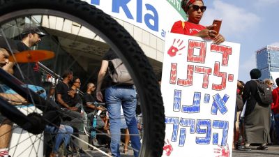 A woman holds a banner reading in Hebrew "our children blood is not lawlessness" as Israelis of Ethiopian origin protest on July 8, 2019 in Tel Aviv after the death of a young man of Ethiopian origin who was killed by an off duty police officer in Kiryat Haim. (AFP/ File Photo)