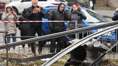 People react standing behind the cordoned off area around the remains of a shell in Kyiv on February 24, 2022. (Photo by Sergei SUPINSKY / AFP)