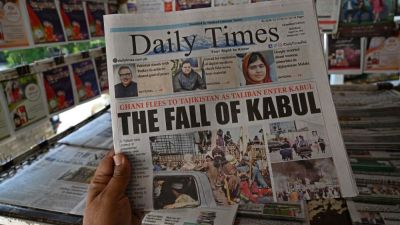 A man holds a newspaper displaying front page news about Afghanistan, at a stall in Islamabad on August 16. (Aamir Qureshi/AFP/Getty Images)